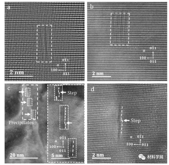 图6 具有代表性的α/MCα 界面(a)MoCrNbV钢和(b)VCrNb钢的显微图像。在单轴拉伸变形后VCrNb钢中相间析出的(c)STEM-HAADF图和(c)中放大的矩形区域1。所有显微图都在[011]区域轴上成像。