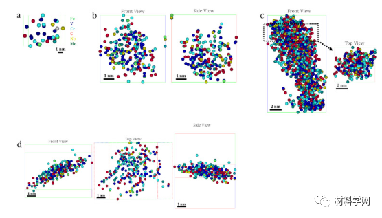 根据确定的临界尺寸及其无序的原子排列,两种钢中的纳米颗粒中都有析出了团簇。这样就可以估算出,团簇大约可以提高150~170MPa的屈服强度。