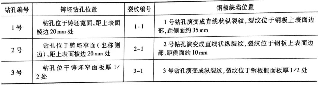 为验证以上判断,找出铸坯缺陷与热轧钢板边部缺陷的对应关系,在Q345C 铸坯试样上做预制裂纹钻孔试验,孔径均为Φ10mm, 孔深为20mm。钻孔后的铸坯按相同工艺热轧成22mm 厚的钢板。铸坯钻孔与钢板缺陷的对应关系见表1-3。