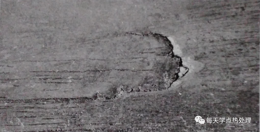 酸洗后,在板面缺陷部位又出现数量颇多且大小不一的“指甲”状缺陷,缺陷裂口大出现在轧制方向前沿的一端,呈现出缺陷表面经轧制而流变的覆盖层特征,另一端可隐约出边界,见图1-70。