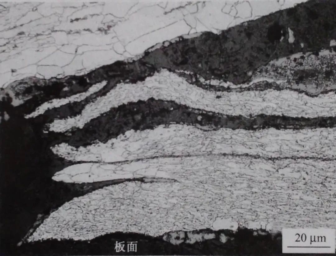缺陷区域板面有一层深度约1.5mm的形变组织层,而钢板下表面表层组织与中部同,为等轴铁素体和珠光体,无形变特征。