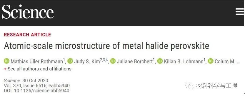 有机-无机杂化钙钛矿作为太阳能材料具有很高的应用潜力,但其微观特性仍不清楚。原子分辨率扫描透射电子显微镜已经为许多晶体太阳电池材料提供了重要认知。近日,来自英国牛津大学的Laura M. Herz & Peter D. Nellist等研究者,用这种方法成功地在低剂量的电子辐照下对甲胺三碘化铅[CH(NH2)2PbI3]薄膜进行了成像。相关论文以题为“Atomic-scale microstructure of metal halide perovskite”于10月30日发表在Science上。