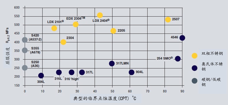 图1 多个不锈钢牌号的屈服强度和耐蚀性能,碳钢作为对比。
