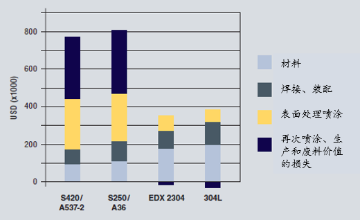 图2 直径20米、高20米的储罐,存贮20℃的液体,设计标准API650。比较双相不锈钢EDX2304、碳钢和304L不锈钢储罐30年寿命周期成本(LCC)。双相不锈钢储罐的建造成本最低,寿命周期成本比碳钢储罐低很多。来源:奥托昆普。