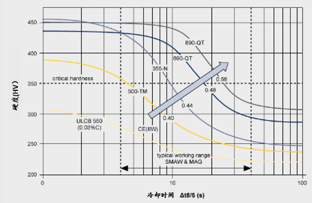 图3显示了焊接后从800°C到500°C的冷却时间(ΔT8/5)对焊缝热影响区(HAZ)性能的强烈影响。尽管在非常短的冷却时间内碳含量控制着了马氏体的硬度,但碳当量(CE)决定了冷却过程中何时形成马氏体。随着CE的增加,临界ΔT8/5会变长,并处于板材现场焊接所用的SMAW和MAG焊接工艺典型的工作条件范围内。CE较高的钢种需要特殊的焊接预防措施,包括对焊接区域进行预热。随着CE的增加,工艺处理窗口变窄(图4)。焊接热输入过多会降低强度和韧性,而热输入过少会导致硬度过高,并增加热影响区的冷裂风险。