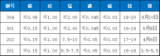 二、为什么不锈钢有不同的钢号? 不锈钢在冶炼过程当中,由于加入合金元素品种不同,不同品种加入量的不同。其特性也是不同的,为了加以区别则冠上了不同的钢号,下面是常见装饰用不锈钢不同钢号“合金元素”含量表仅供参考: 化学成分(质量分数,%) 304不锈钢 性能介绍:304不锈钢是最普遍的钢种,作为一种用途广泛的钢,具有良好的耐蚀性、耐热性,低温强度和机械特性;冲压、弯曲等热加工性好,无热处理硬化现象(无磁性,便用温度-196℃~800℃)。 适用范围: