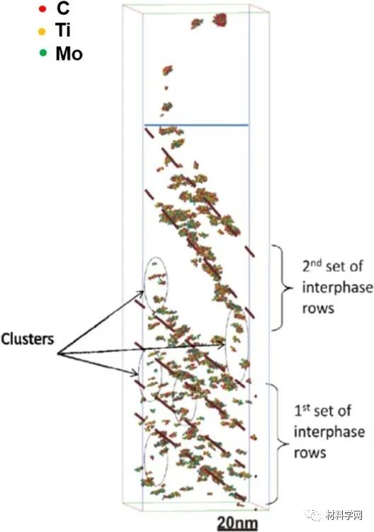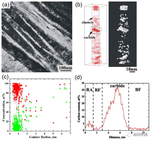 图2.(a)在热轧低碳钢的铁素体中形成的C-Cr团簇的选定原子图。(b)C-Mo-Ti团簇和(c)(Ti,Mo)C析出在C-Mo-Ti钢的铁素体中。(d)团簇和纳米颗粒的溶质浓度与在C-Mo-Ti钢中形成的Gunier放射性的函数关系。图5.相间析出的各种形成机制示意图:(a)产生平面薄片的壁架机制和(b)产生弯曲薄片的准壁架机制;(c)导致纤维相间析出的超边缘机制(I将碳化物固定在一个单元架上,II-碳化物的生长超过铁素体的生长,以及III-壁架不会从碳化物上脱开,从而导致纤维状碳化物的形成);(d)扩展的壁架机制图6.(a,c)在NPLE(b)和PE(d)条件下,铁素体/马氏体(本来是奥氏体)界面上的碳原子图和(b,d)组成图图7.转变温度对(a)层间间距和(b)沉淀物数量密度的影响图9.(a)碳原子图,显示了热轧低碳钢的铁素体中的Cottrell气氛;(b)C,Mo和Nb原子图显示了TMP后Nb-Al-Mo钢的多边形铁素体中的细小颗粒,(c)整个细小析出物的代表性浓度曲线。图11. TEM显微照片,显示了贝氏体的形态:(a)颗粒贝氏体[220];(b)针状铁素体[220];(c)上贝氏体[221];(d)下贝氏体[220]。PF是多边形铁素体,BF是贝氏体铁素体,M是马氏体,RA是残余奥氏体。图12.位错系统的3D结构,其在0.63%的应变下具有强的析出物,显示出错综复杂的位错网络,嵌入了Orowan环图13 (a)纳米贝氏体的明场TEM图像,(b)碳原子图和相应的7.5 at。高炉中簇和碳化物的%C等浓度表面,(c)Fe-C簇和颗粒的溶质浓度随Guinier半径的变化,(d)跨Fe-C碳化物的组成分布图14 Fe-20.1Ni-1.8Mn-1.6Ti-0.59Al(wt。%)合金在823 K时效时的析出演变:(a)3.88 at。%Ti,2.92 at。Mn含量为3.38 at。600 s后出现棒状和板状(Fe,Ni)3(Ti,Al,Mn)和球形NiMnAl沉淀的%Al等浓度表面,(b)沿图中所示方框横跨板状颗粒的浓度分布(一种); (c)原子图显示Mn和Al在(Fe,Ni)3 Ti析出物中的偏析以及新的(Fe,Ni)3(Mn,Al)析出物的成核