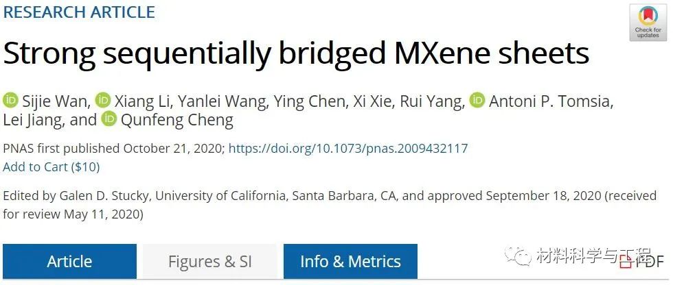 MXene材料是一类具有二维层状结构的金属碳化物和金属氮化物材料,其外形类似于片片相叠的薯片。碳化钛(Ti3C2Tx) MXene具有优良的导电性和机械性能,在航空航天和柔性电子领域具有很大的应用潜力。然而,将MXene纳米片组装成宏观高性能纳米复合材料具有挑战性,从而限制了MXene的实际应用。近日,来自北京航空航天大学的程群峰等研究者,通过氢键和离子键的顺序桥接制造了高强高导电的MXene薄片。相关论文以题为“Strong sequentially bridged MXene sheets”发表在PNAS上。