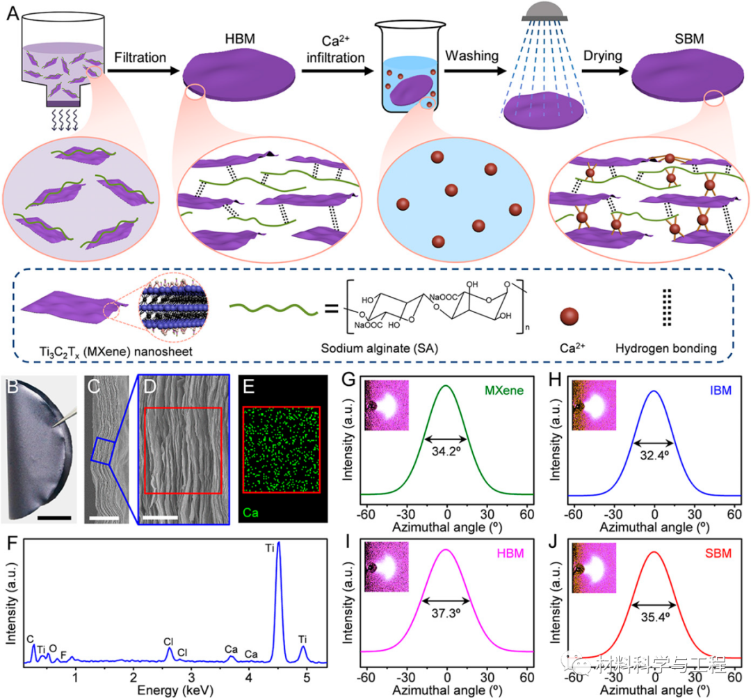 在这项工作中,研究者报道了通过顺序桥接过程构建高性能的MXene基板,其中MXene纳米板首先通过氢键与SA桥接,然后通过离子键与钙离子(Ca2+)桥接生成杂化的MXene-SA构建块。顺序桥接MXene (SBM)板材的平面抗拉强度为436 MPa,韧性为8.39 MJ/m3,杨氏模量为14.0 GPa,分别是纯MXene板材的6.9倍、13.5倍和2.5倍。此外,SBM薄片具有高导电性(2,988S/cm)和非凡的归一化EMI屏蔽效能(SE) (58,929dB·cm2/g)。在最大拉应力水平为245MPa时,SBM片材的疲劳寿命超过2×105次。经过100次360度折叠后,SBM片材可以保持原有电导率的78.5%和原有抗拉强度的87.2%。在潮湿环境下,它们也表现出优异的长期电气稳定性。分子动力学(MD)模拟表明,同时提高拉伸强度和韧性是由于有效的载荷转移和MXene纳米薄片的大滑移。