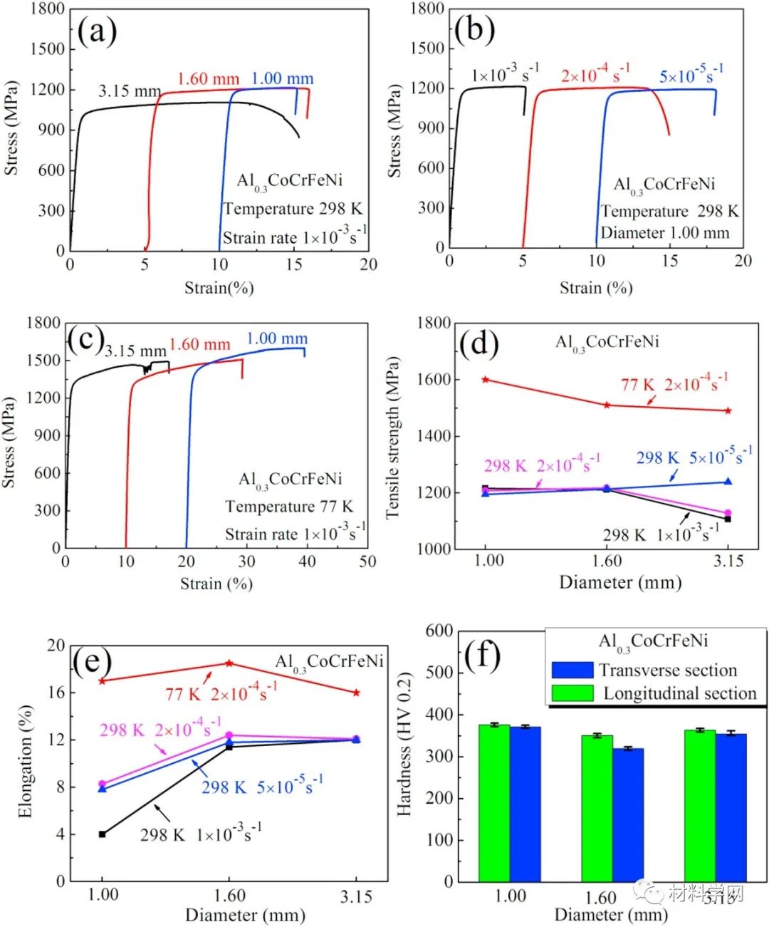 综述所述,本文研究了五元Al0.3CoCrFeNi HEA纤维的微观结构和力学性能的影响。采用热旋锻和热拉工艺制备的HEA纤维主要织构为<111>和<100>织构。Al和Ni原子之间的强相互作用产生了大约200nm的B2 Al-Ni粒子。在HEA纤维的拉伸试验中,析出的颗粒和细小的晶粒共同促进了纤维的持续高强度和延展性。特别是直径为1.00 mm的纤维在298K时表现出了显著的拉伸强度和延展性,分别为1207 MPa和7.8%,在77K时分别提高到1600 MPa和17.5%。与298K时的平面滑移变形机制相比,77K时变形后出现了形变诱导的纳米孪晶,从而提高了77k时的拉伸强度和延性。HEA纤维在低温下强度与延性的良好结合,为未来高性能HEAs工程材料的开发开辟了一条创新的道路。