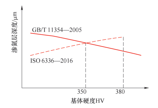 图1 某齿轮在两种界限硬度值下的渗氮层深度