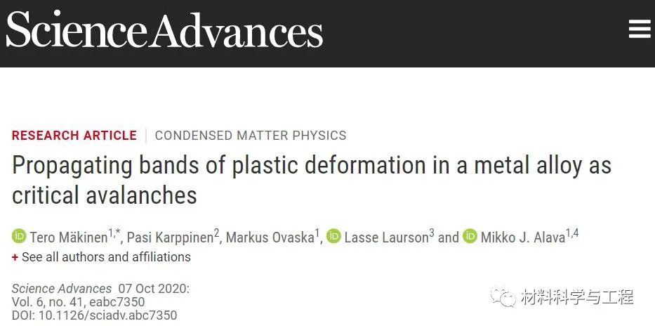 近日,来自芬兰埃斯波阿尔托大学的Tero Mäkinen等研究者证明了,在铝合金的拉伸变形实验中通过使用高分辨率成像,带速度显示较大波动。相关论文以题为“Propagating bands of plastic deformation in a metal alloy as critical avalanches”发表在Science Advances上。