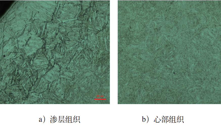 图5 气体渗氮后渗层组织及心部组织(普氮)