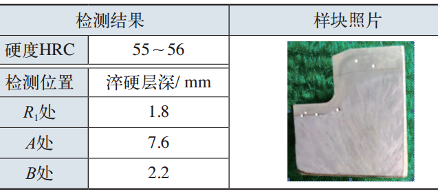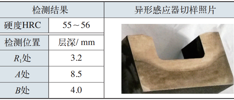 异形感应器具体设计参数见表4,调试参数见表5,淬硬层检测结果见表6。