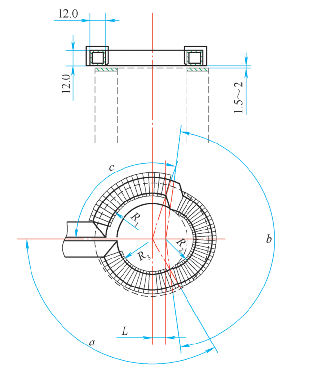 注意事项:在感应器调整过程中,注意感应器底平面与零件端面间隙1.5~2mm,各处间隙均匀;定期清理有效加热面的氧化皮。从表3可以看出,常规平面加热感应器存在不足之处:R1处淬硬层深太浅,接近下限,由于齿高10mm,齿顶、齿根温差较大,若控制不注意,容易产生裂纹,故而设计如图4所示的异形感应器。异形感应器有效圈添加开口朝下的“∏”形导磁体,如图5所示。