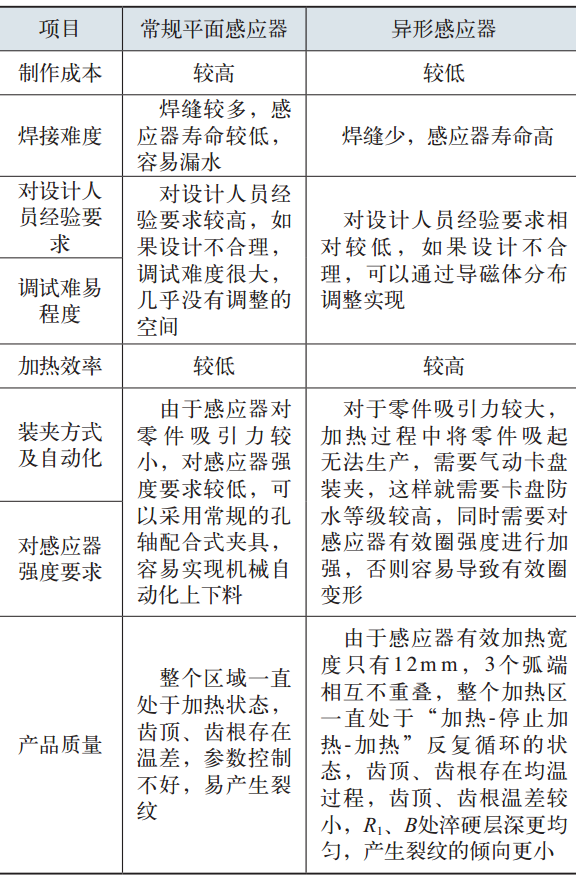 此类平面带有齿的零件淬火,需要谨慎对待。根据以上两种感应器设计、调试及检测结果,其优缺点对比见表7。