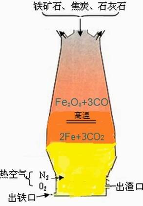 高炉生产时,从炉顶装入铁矿石、焦炭、造渣用熔剂(石灰石),从位于炉子下部沿炉周的风口吹入经预热的空气。在高温下焦炭中的碳同鼓入空气中的氧燃烧生成的一氧化碳和氢气,在炉内上升过程中除去铁矿石中的氧,从而还原得到铁。炼出的铁水从铁口放出。