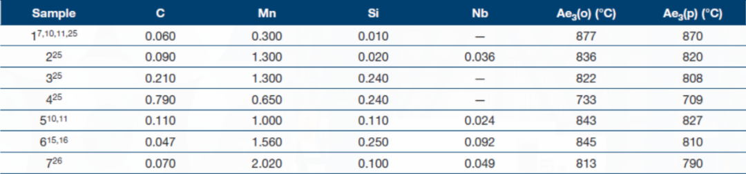 在过去的10年里,McGill大学的热变形实验室研究了7种不同成分的钢,如表1所示。给出了正交平衡(全平衡)和准平衡的(亚稳态)Ae3温度。正交平衡描述了在相变过程中代位元素和间隙原子都能分配的条件。另一方面,准平衡态仅仅考虑间隙原子的分配,如碳的分配。这种差异是由于代位原子比间隙原子半径要大的多,所以代位原子扩散慢得多。