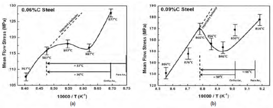 最近,文献中出现了有关在Ae3温度以上奥氏体向铁素体动态转变(DT)的各种研究[5~17]。Yada和他的同事在20世纪80年代末首次发现了这种不寻常的冶金现象,在这项工作中,他们在Ae3线以上166℃的温度下进行了热压缩和实验室轧制模拟,在20年的时间内,吸引了大量的研究人员广泛研究这种不寻常的冶金行为,并确定了DT对工业热轧操作中的影响[19~22]。已经提出了几种热力学模型来解释和预测动态相变的发生。动态相变的驱动力可以是位错储存能[23],外加应力的机械激活[24],或者动态相软化产生的能量[6]。最近10年来这个主题得到很大的发展,其中包括参考文献5的综合性综述论文。