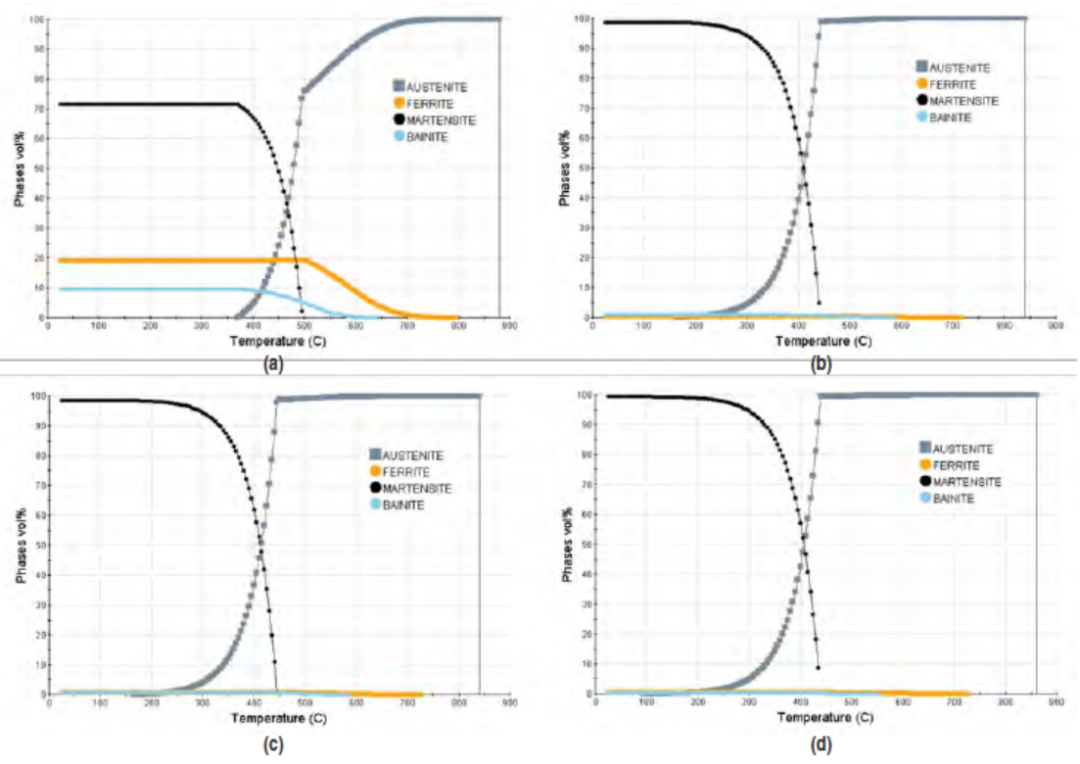 图4 试样1 (a)、试样2 (b)、试样5 (c)和试样6 (d)水淬后相的计算体积分数。从高于Ae3的温度到室温的冷却时间为2秒
