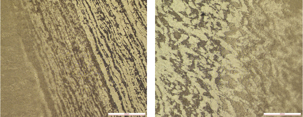材料微区含碳量严重超标,主要由于TL4521这个材料合金元素含量很高,合金元素沿轧制方向偏析形成带状组织,通常钢液在冷却凝固过程中以枝状晶的方式长大,在不同时期凝固的晶内和枝晶间的化学成分不均匀,存在合金元素偏析。带状组织分一次带状和二次带状之分。合金元素的带状偏析会造成碳元素的条带状偏析,不同条块区域的相变温度就存在差异,在热处理或加工后的冷却过程中,先共析铁素体优先在碳含量低、Ar3高的位置析出,同时向相邻区奥氏体中排出碳,进一步造成碳的不均匀分布。这个过程在奥实体化的冷却过程中发生,冷却越慢,先共析铁素体转变越充分,碳元素分布越不均匀。由于这几种原因造成微区含碳量严重超标。于是我们按照图样要求,对齿环材料进行更换,对于齿坯正火金相严格控制,采用上限温度正火,加长正火时间来改善正火金相。后来的产品严格按照焊接工艺执行,焊前预热焊后缓冷的工艺,所有产品没有出现裂纹。焊接金相见图11。