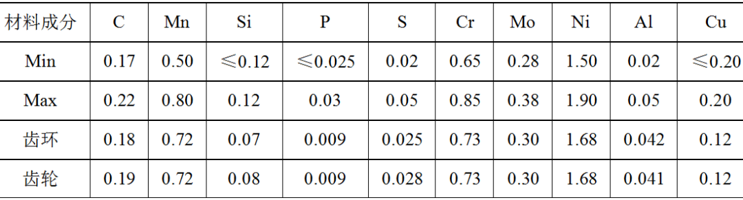 根据标准计算出的碳当量大于0.4%,产品应该对焊接工艺进行控制。但是产品出现热裂纹,就是调整工艺也很难避免。我们认为这个产品主机厂已经试制成功,并且批量生产好多年,是否我们采购的材料不符合图纸要求,或说图样对于产品焊接有什么特殊要求。于是我们对产品图样进行核查,发现齿环材料图样要求是TL4227,根据我们以往的概念,齿环、齿轮应该采用同一种材料,而不是2种材料。对于TL4227的化学成分见表2。