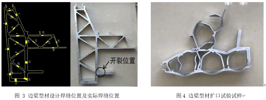 对边梁型材依据TB/T3260.4-2011《动车组用铝及铝合金 第4部分:型材》进行扩口试验,边梁型材设计焊缝位置及实际焊缝位置见图3,边梁型材扩口试验试样见图4。结果表明型材的挤压焊缝不存在焊合不良现象。