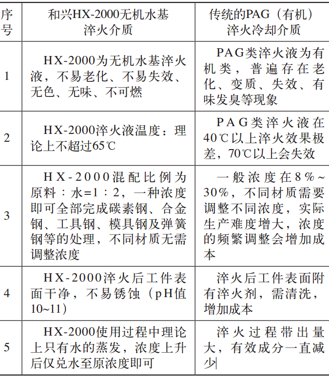 2)“和兴HX-2000无机水基淬火介质”的特点。传统的有机淬火冷却介质在使用过程中经常出现老化、变质,甚至失效的问题,存在很大的质量隐患;并且随着季节的变化,淬火液的浓度也会随之改变,不易保存和控制。“和兴HX-2000无机水基淬火介质”配比单一,易保存,操作简单。与传统的PAG淬火冷却介质的物理特点对比见表2。