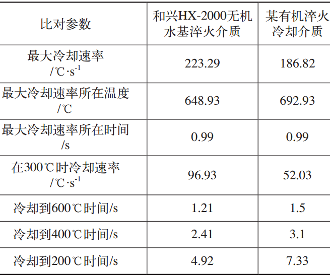 在试验前,对“和兴HX-2000无机水基淬火介质”进行冷却特性检测,并选取我厂正在使用的某有机淬火剂进行对比分析,具体数据见表3。