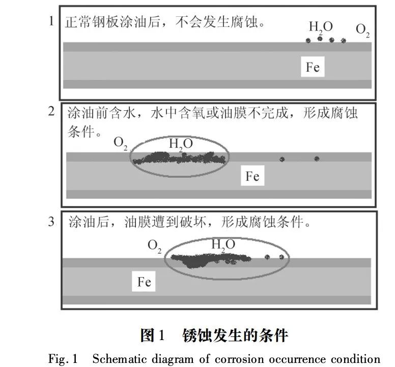 汽车板锈蚀一般是指用户开始使用时发现的表面锈斑和锈点,其主要成分是 Fe2O3,为附着于钢材表面的水与空气中的氧发生原电池反应生成的腐蚀产物。水滴及水蒸气冷凝(纳米级)都会致使钢材发生锈蚀现象,而涂油是使钢材隔绝水和空气的一种低成本防腐蚀方法。若涂油前钢板表面已存在部分水,则油膜的完整性会遭到破坏,从而减弱其防腐蚀能力。而涂油后若外界破坏因素较大,
