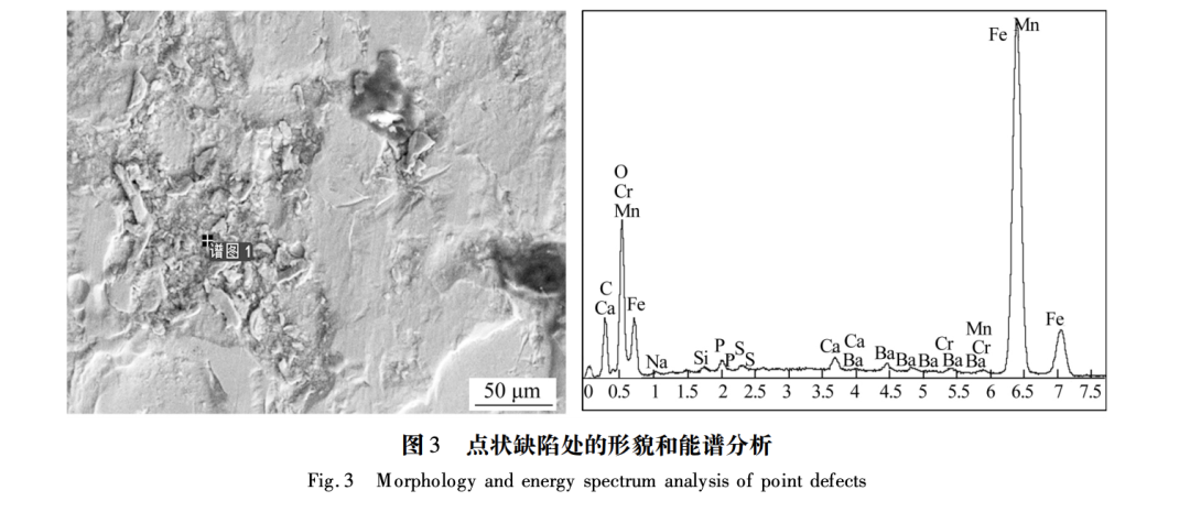 分别对缺陷钢板进行取样,利用扫描电镜作能谱分析。分析前使用超声波对缺陷部位进行清洗以除去异物,保证缺陷的真实形态。由图3和图4可以看出,在点状锈蚀和条带状