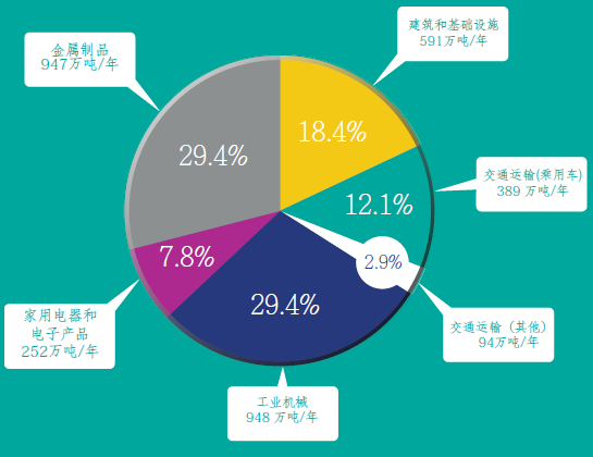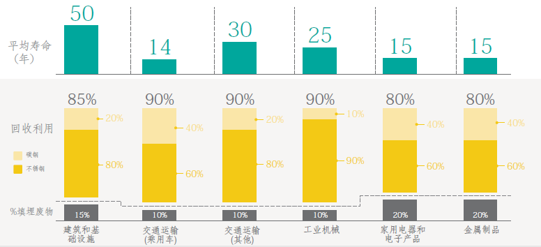 过去20年中国不锈钢产量的增长带动了全球不锈钢产量以每年约6%的速度递增。2015年,中国不锈钢产量占世界总量一半以上(53%)。不锈钢消费量从2000年的10%上升为39%。平均而言,目前消费后可回收的材料大约是20年前投入使用的,这充分说明不锈钢使用寿命长。从该图可以看出,理论计算的最大再生量受到报废回收不锈钢的可用性限制,报废回收可用性又取决于终端产品过去的产量、增长率和使用寿命。