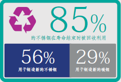 由于不锈钢耐用且寿命长,通常要使用多年才能回收利用。平均寿命预计在20年左右,但也有超过一个世纪的。所有仍在使用的不锈钢都是潜在的可再生资源的宝贵来源。