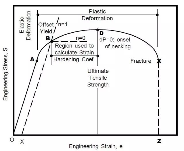 实际上,很难确定材料从弹性区转变为塑性区的确切点。如图2,绘制了应变为0.002的平行线。用该线截断应力-应变曲线,将屈服的应力确定为屈服强度。屈服强度等于发生明显塑性变形的应力。大多数材料并不均匀,也不是完美的理想材料,材料的屈服是一个过程,通常伴随着加工硬化,所以不是一个具体的点。对于多数金属材料应力-应变曲线看起来类似于图3所示曲线。当加载开始以后,应力从零开始增加,应变线性增加,直到材料发生屈服以后,曲线开始偏离线性。