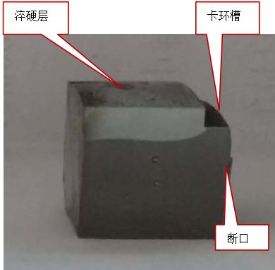 试验结果:肉眼观察当卡环槽移动至喷水圈位置时,卡环槽底部颜色呈亮红色。淬火后,切检同样部位,检验其淬火结果。