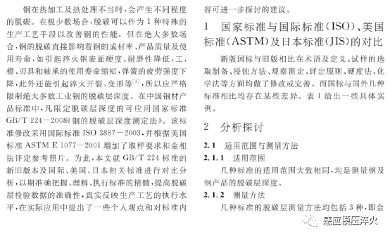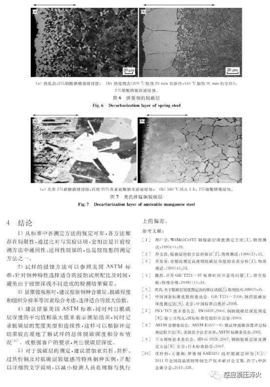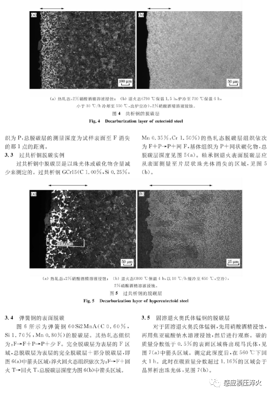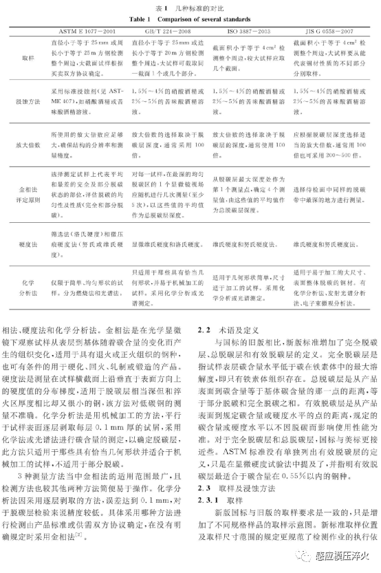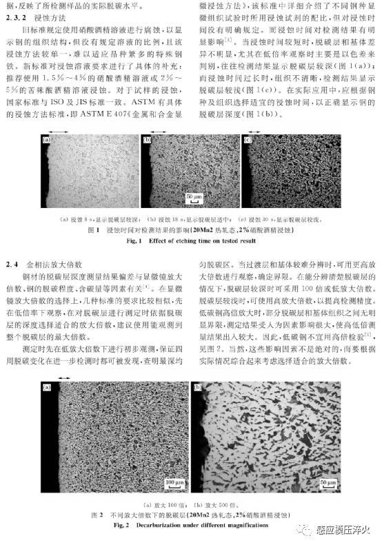 摘要:钢在热加工及热处理不当时会产生不同程度的脱碳。在中国钢材产品标准中,凡限定脱碳层深度的可应用GB/T224《钢的脱碳层深度测定法》。该标准修改采用ISO3887, 并根据 ASTM E1077添加了取样要求和金相法评定参考照片。就标准的新旧版本及国外相关标准进行对比分析,指出了国标在试样的选取及制备、观察测定、结果表示方式等方面均与国外标准有所不同。分析了亚共析、共析、过共析钢在不同状态下的脱碳层实例。提出了一些个人观点和对标准内容可进一步探讨的建议。