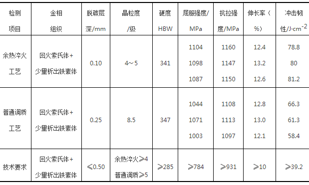表1 余热淬火工艺与普通调质工艺检测结果对比