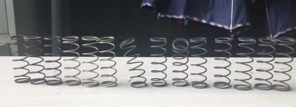 图4 压缩弹簧(注:左1~2未进行表面处理;左3~5为镀锌处理件;左6~9为不带芯杆渗锌件;左10~12为带芯杆渗锌件)