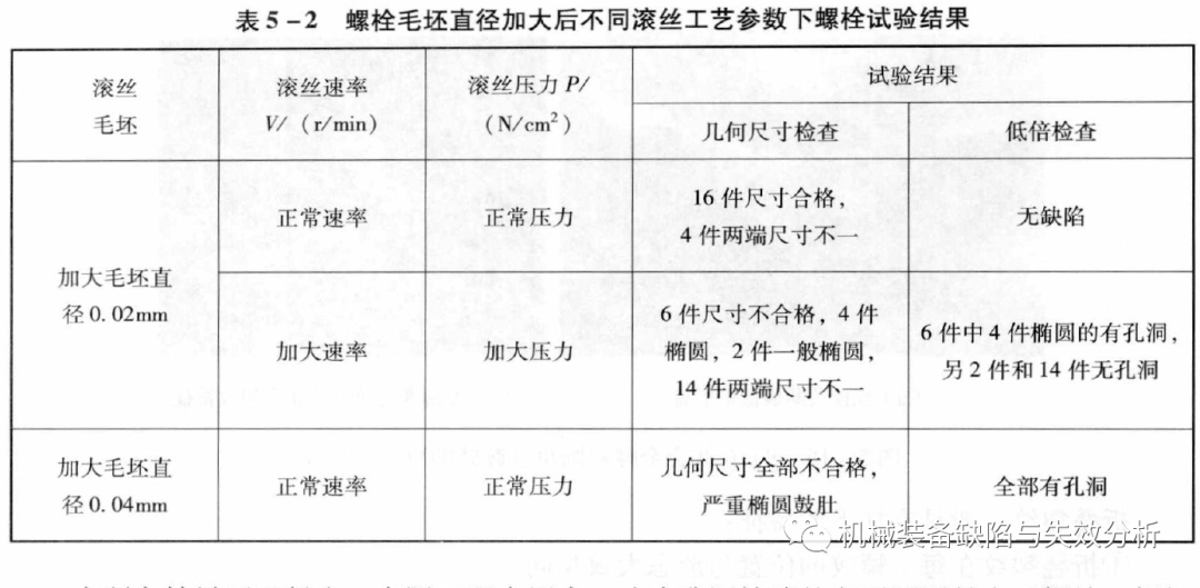 试验件毛坯直径加大0.02~0.04mm ,经正常滚丝压力和速度、加大滚丝压力和速度两种工艺的试验结果见下表: