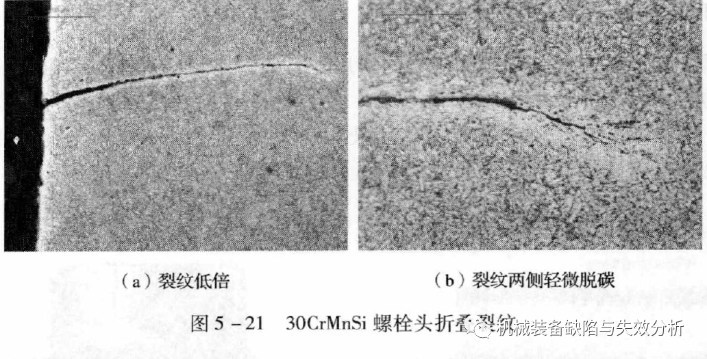 锻锻工艺不当或毛坯表面存在未清理干净的氧化皮也同样会导致折叠裂纹。这类折叠裂纹当经过高温后,对于钢来说,一般裂纹两侧会出现脱碳的现象,而对于钛合金来说则会出现富氧a层。图5-21给出了30CrMnSi螺栓头热锻成形导致的折叠裂纹及裂纹两侧的脱碳形貌。