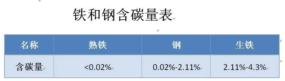 看到了吧。通常把含碳量少于0.02%的叫熟铁,大于2.11%到4.3%的叫生铁,而中间的就是钢。