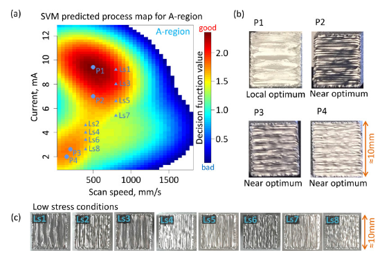 图2 (a)A区的SVM预测过程图。(b)样品的良好顶表面施加了局部最佳条件P1和接近最佳条件P2〜4,(c)样品的最佳顶表面施加了接近最佳条件Ls1〜8的低应力。