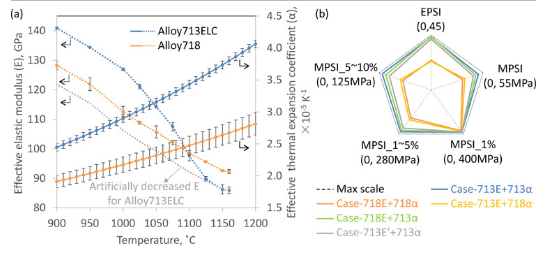 图8 (a)合金713ELC和718随温度变化的各向同性有效弹性模量(E)和有效热膨胀系数(α)的测量值。(b)绘制五个指数的雷达图,这些指数反映了在单道熔化条件P1下E和α对Alloy713ELC和Alloy718的非焊接性的影响。括号中给出了每个轴的最小和最大比例(最小,最大)。