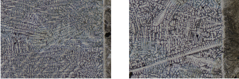 由图2可知,手持式X射线荧光光谱仪可以直接测出Fe基熔覆层的Cr含量。由于液压支架活柱、中缸所处矿井环境大多含有腐蚀介质,因此为了提升液压支架的使用性能,其活柱、中缸可以采用激光熔覆技术制备一层Fe基熔覆层,而要保证熔覆层的耐蚀性要求,熔覆层必须含有足够多的Cr,故激光熔覆时所用的激光熔覆材料为高Cr不锈钢Fe基自熔性粉末。然而,激光熔覆过程中熔覆层显微组织晶界处会析出碳化铬,当Cr含量不足时,会出现贫铬区,而贫铬区往往优先发生腐蚀,并且贫铬区的Cr含量相比未腐蚀区域偏低。因此,采用手持式X射线荧光光谱仪检测液压支架活柱、中缸表面Fe基熔覆层Cr含量,通过对比不同区域位置的Cr含量,初步判断Fe基熔覆层腐蚀失效的原因。Fe基激光熔覆层腐蚀失效的一个重要原因是工艺匹配不合理,要确定腐蚀失效是否由工艺原因引起,需要对Fe基熔覆层进行组织分析。首先制备Fe基激光熔覆层金相观察试样,主要流程为取样→磨样→抛光→腐蚀,然后采用金相显微镜对金相组织进行观察。Fe基激光熔覆层显微组织对比如图3所示。