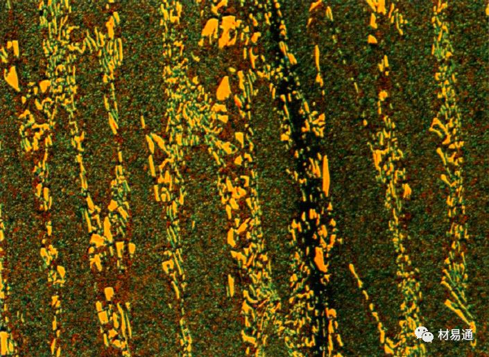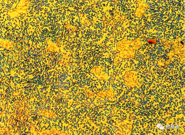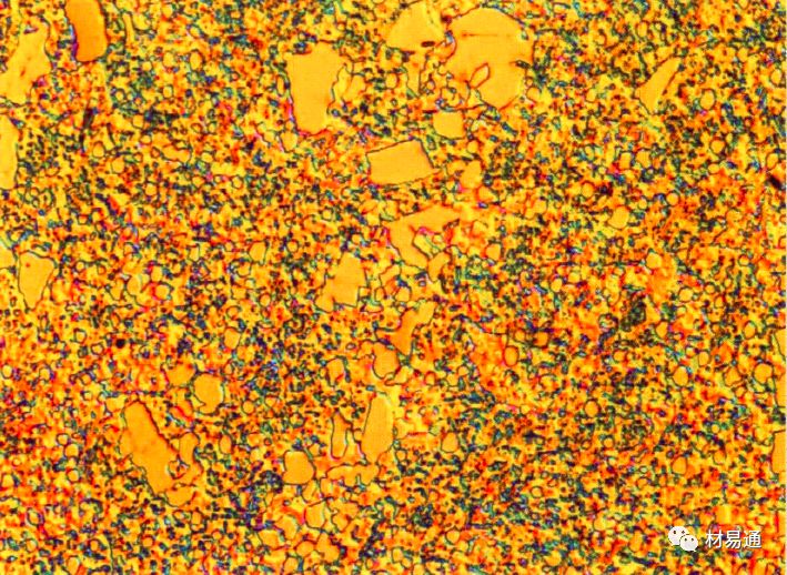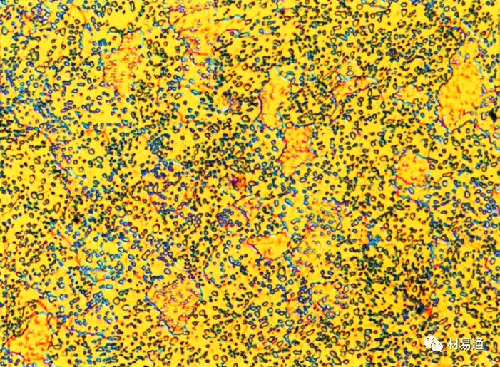 组织说明 | 由于锻造及均匀化退火工艺不当,材料存在严重的枝晶偏析,蓝色区域为高碳高合金区域,黄色区域为低碳低合金区域。基体组织为细小点状、粒状珠光体。 |