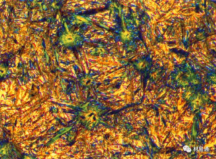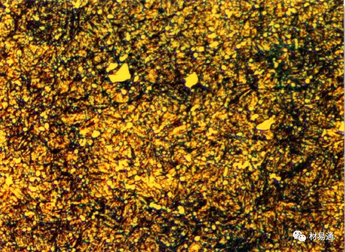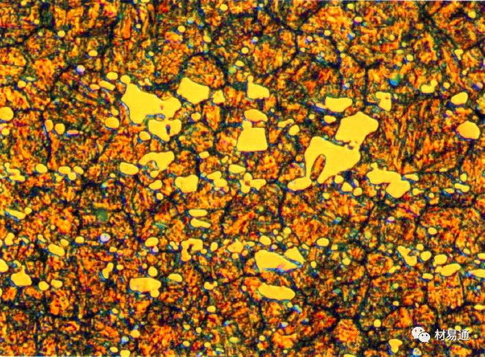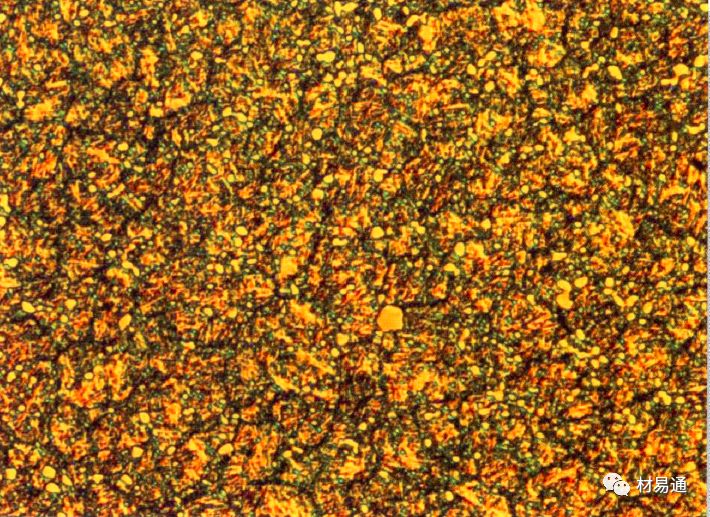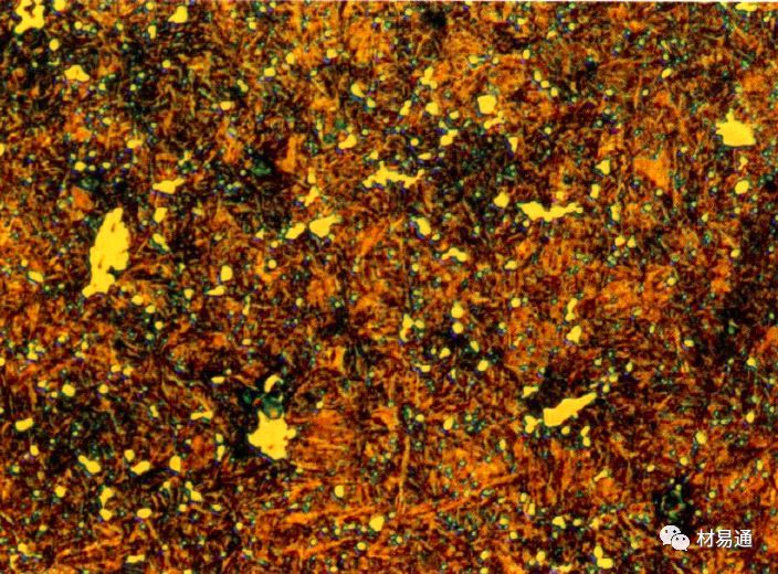 组织说明 | 回火马氏体(绿色) +残留奥氏体(黄色,中心区位于马氏体针间) +块状及颗粒状碳化物(黄色),在碳化物集中处,由于奥氏体碳含量的增加,降低了马氏体转化温度,增加了残留奥氏体的数量及回火稳定性,出现回火不足现象。 |
