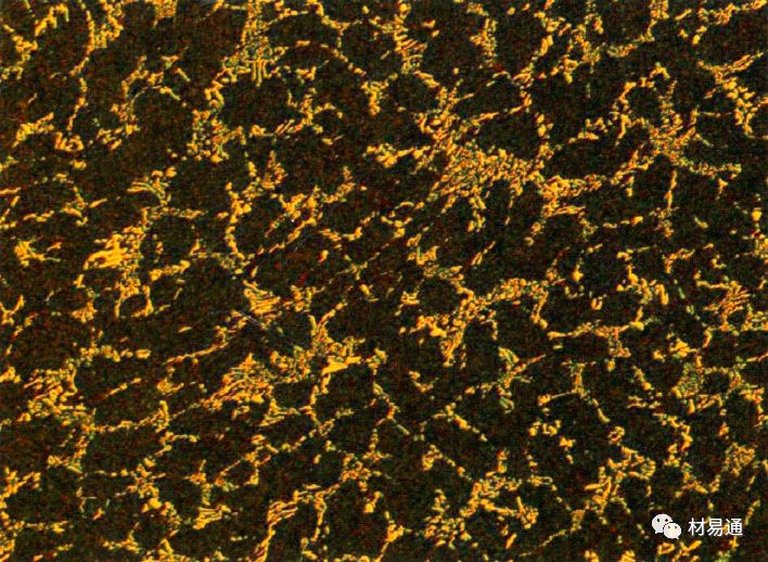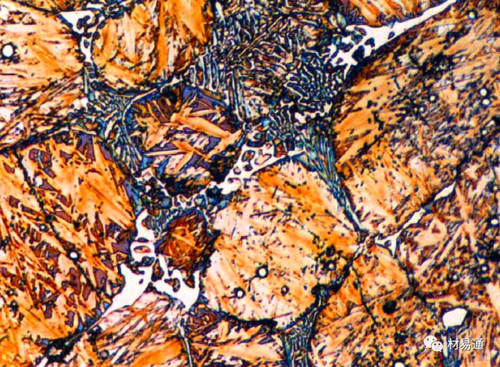 组织说明 | 粗大针状马氏体(棕色) +残留奥氏体(黄色) + 晶界大量粗大网状菜氏体。属严重过烧组织。 |