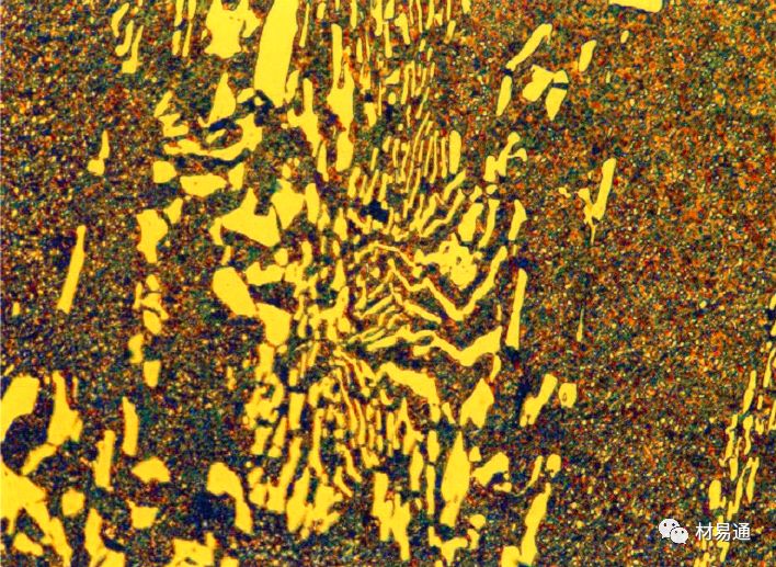 组织说明 | 粗大共晶莱氏体(鱼刺状)+碳化物(桶黄色块状) ,奥氏体转变为针状马氏体+残留奥氏体(蓝色包围的红色区域)。 |