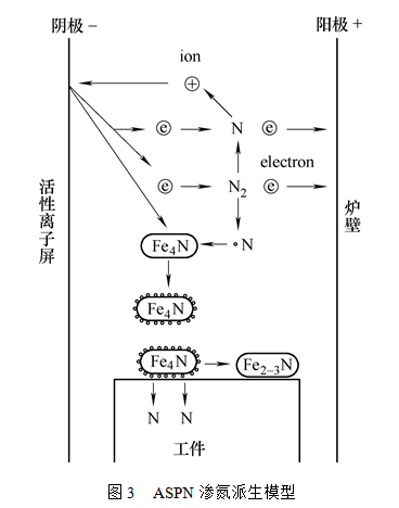 虽然Georges发明了ASPN技术,但早期的ASPN技术的基础研究都是在英国伯明翰大学表面工程研究室进行的。Li C. X.等人通过试验发现,ASPN可以获得和DCPN一样好的渗氮效果,并较好地解决了DCPN技术难题,是一项值得推广的新技术。他们还在试验的基础上,参照经典的Kölbel离子渗氮模型上,最先提出了一个ASPN 的渗氮模型(见图2),认为从笼子表面溅射下来的Fe粒子与空间的N原子结合形成FeN粒子,这些粒子沉积在渗氮试样的表面发生分解,释放出来的活性氮原子渗入工件表面实现渗氮;在模型的右端,从笼子上溅射下来Fe4N粒子沉积在工件表面也能起到渗氮的作用,但其未解释这部分的渗氮机制。