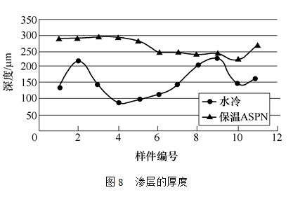 图7和图8分别是这两种炉子渗氮处理后不同位置的试样的表面硬度和渗氮层的厚度的分布。结果表明,用保温式ASPN设备处理的试样表面硬度和渗层厚度的均匀性均好于水冷式离子渗氮炉,这说明保温式ASPN炉内工件的温度均匀性优于水冷式离子渗氮炉。另外,保温式ASPN设备可比水冷式离子渗氮炉节电25%以上。